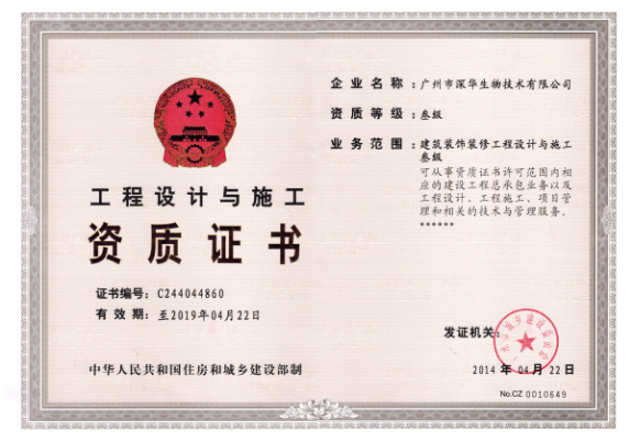 廣州市深華生物技術(shù)有限公司喜獲建筑裝飾裝修工程設(shè)計與施工資質(zhì)證書叁級,讓廣州深華公司在權(quán)威機構(gòu)的資質(zhì)領(lǐng)域又新增一份實力的證明。