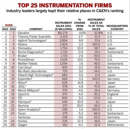 在今年揭曉的2013年全球儀器公司排名前25名單中,排名前十情況與2012年變化不大,排名第一依然為丹納赫(Danaher),排名第二為賽默飛世爾科技(Thermo Fisher Scientific,Life Technologies的2013年收入未記在內),排名第三為安捷倫(Agilent Technologies)。其中,排名發(fā)生最大變化的是羅氏診斷(Roch Diagnostics),它從2012年排名第11上升至排名第6;并且由于Life Technologies被賽默飛世爾收購,Life Technologies從排行榜中消失。此外,賽多利斯(Sartorius)首次進榜,排名第23位。詳細名單名單見下: