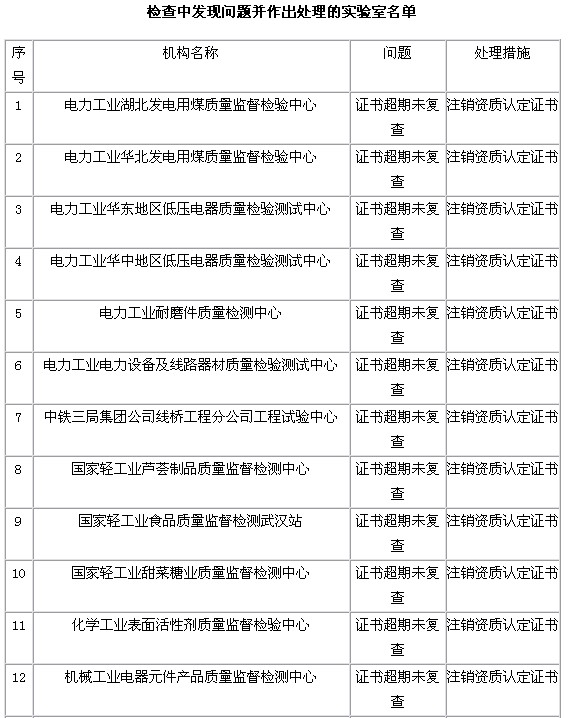1.此次檢查發(fā)現了個別實驗室的質量管理體系存在較大問題,部分實驗室證書到期未申請復查(名單見附件),將分別采取限期整改或者注銷資質認定證書的處理措施。